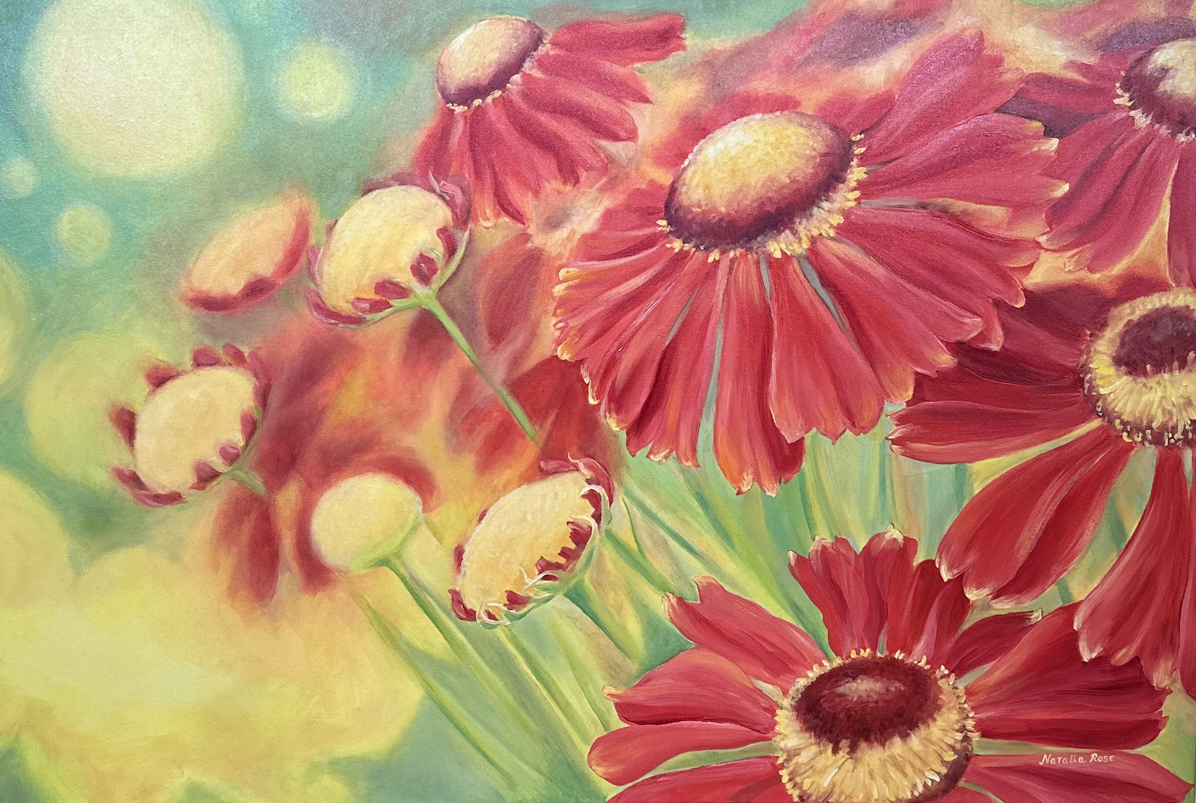 Natalia’s oils and acrylics are bold and bright. They grasp attention and hold it; they capture light in beautiful ways, making them alive and alight.