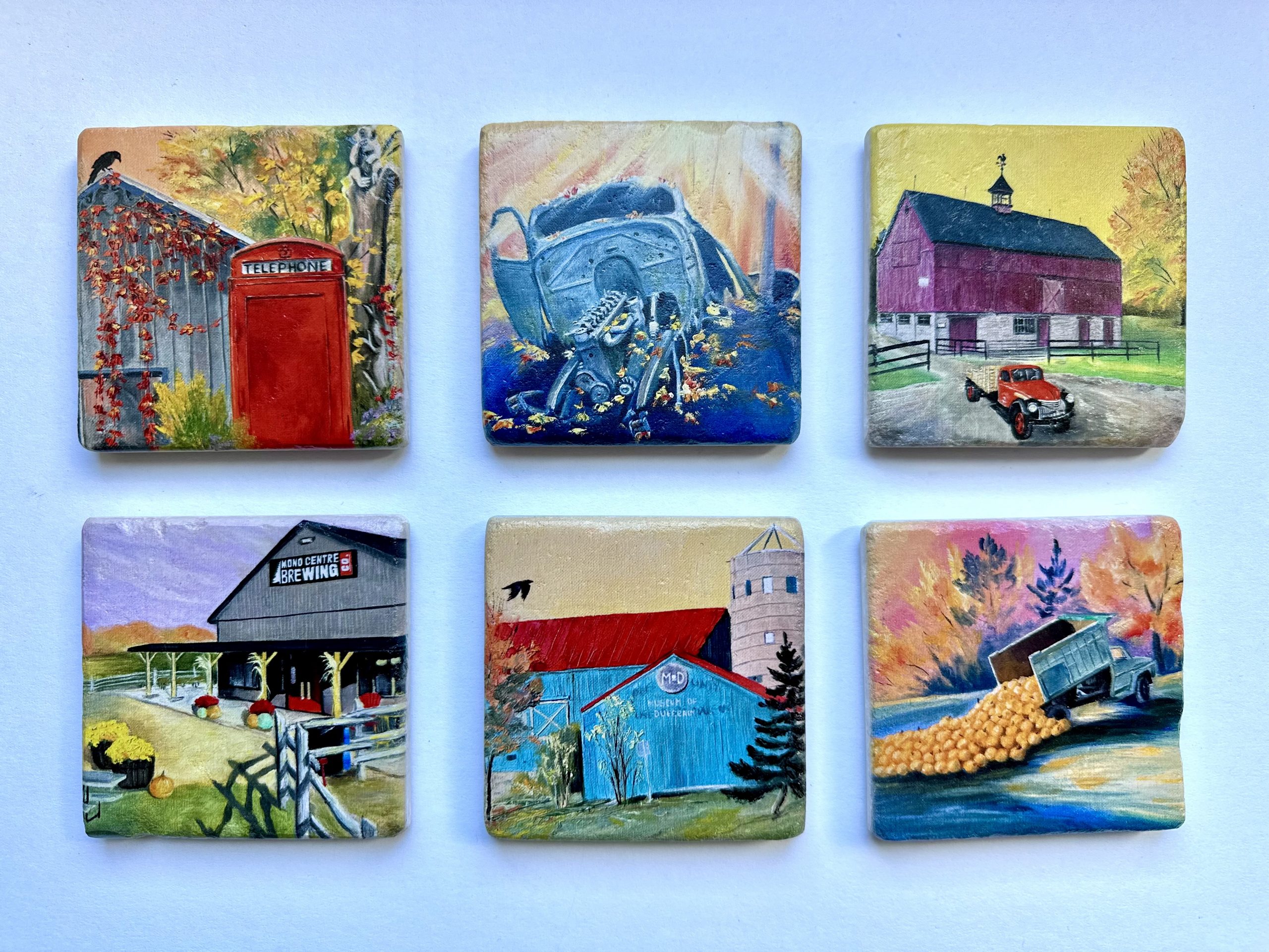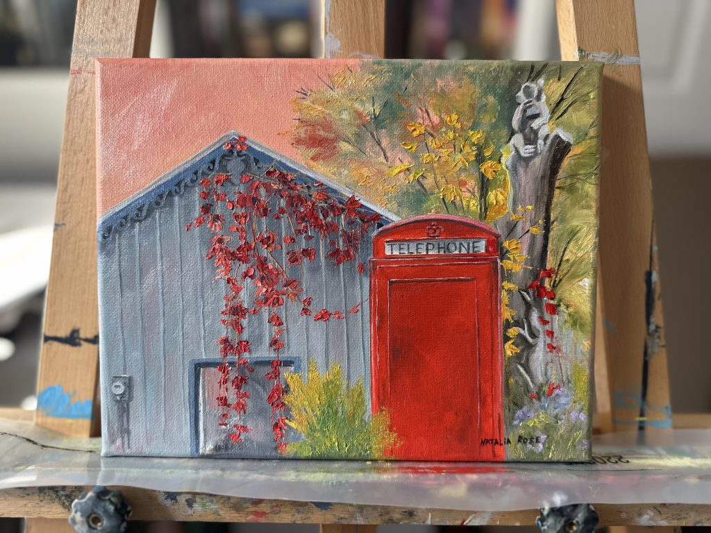 My new gig is a newly started series of local landmarks and focal points painted in oils, and my first freshly completed work depicts a historic telephone booth in the Mono Center near the Mono Cliffs Park. It’s so picturesque in the fall when the vines of virginia creeper turn red, creating a bright garland that, together with the red telephone booth, create a beautifully balanced sight.