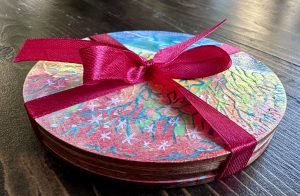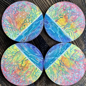 Hand-painted wooden coasters, winter-themed with bright colours. The branches are textured. The painted side is done with acrylics and varnished to protect it from elements.
