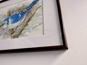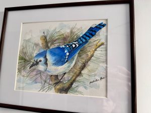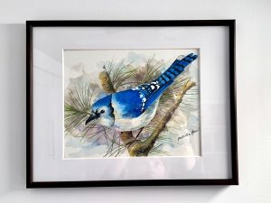 Original watercolour painting showing a blue jay bird sitting on a branch of a white pine tree. This painting is framed in a beautiful dark-brown wooden frame with a 2″ white mat.