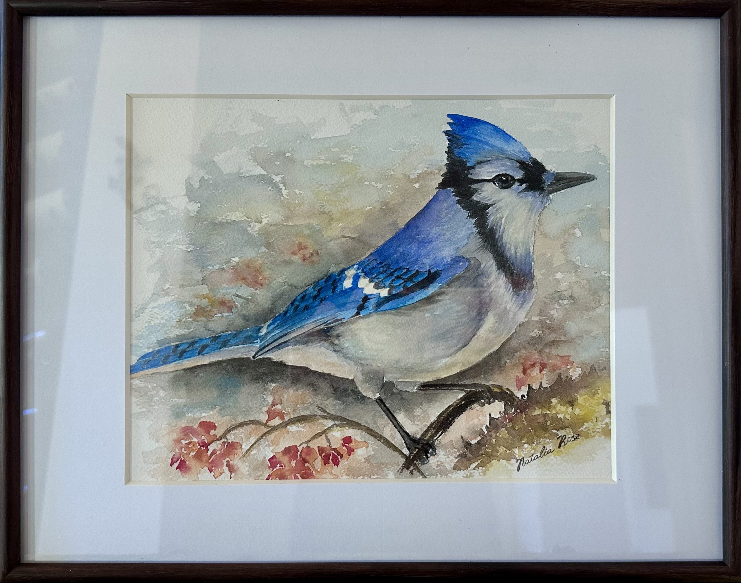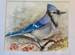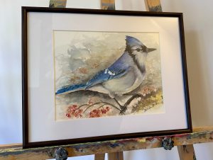 Original watercolour painting of a blue jay bird sitting on a stem of a a dried sunflower. This painting is framed in a simple dark brown wooden frame with a 2″ white mat.