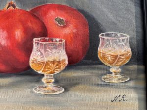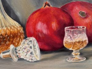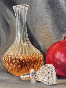 This painting is so beautiful that when you look at the glass of the decanter and the drink in it, you just can’t help but feel the depth and the play of colours as they reflect the light, while allowing it flow through the liquid gold.