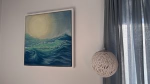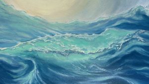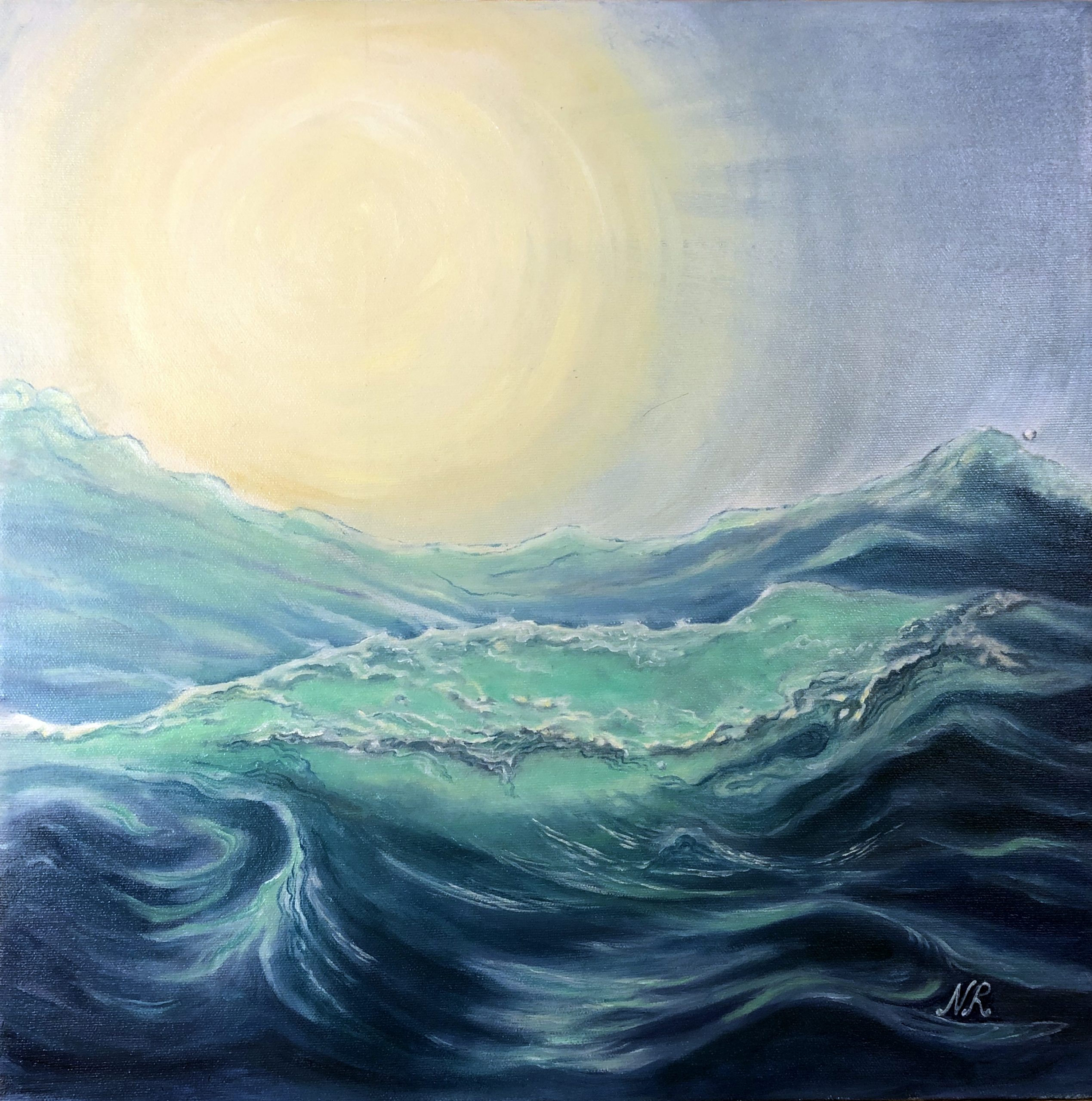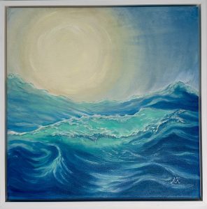 Original oil painting on 2″ deep gallery stretched canvas. Emerald wave is completed in an interestingly intricate style which almost makes it abstract; the sun ball is shining above the water with its light penetrating through the water. Framed in a white floating frame and ready to hang.