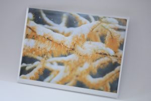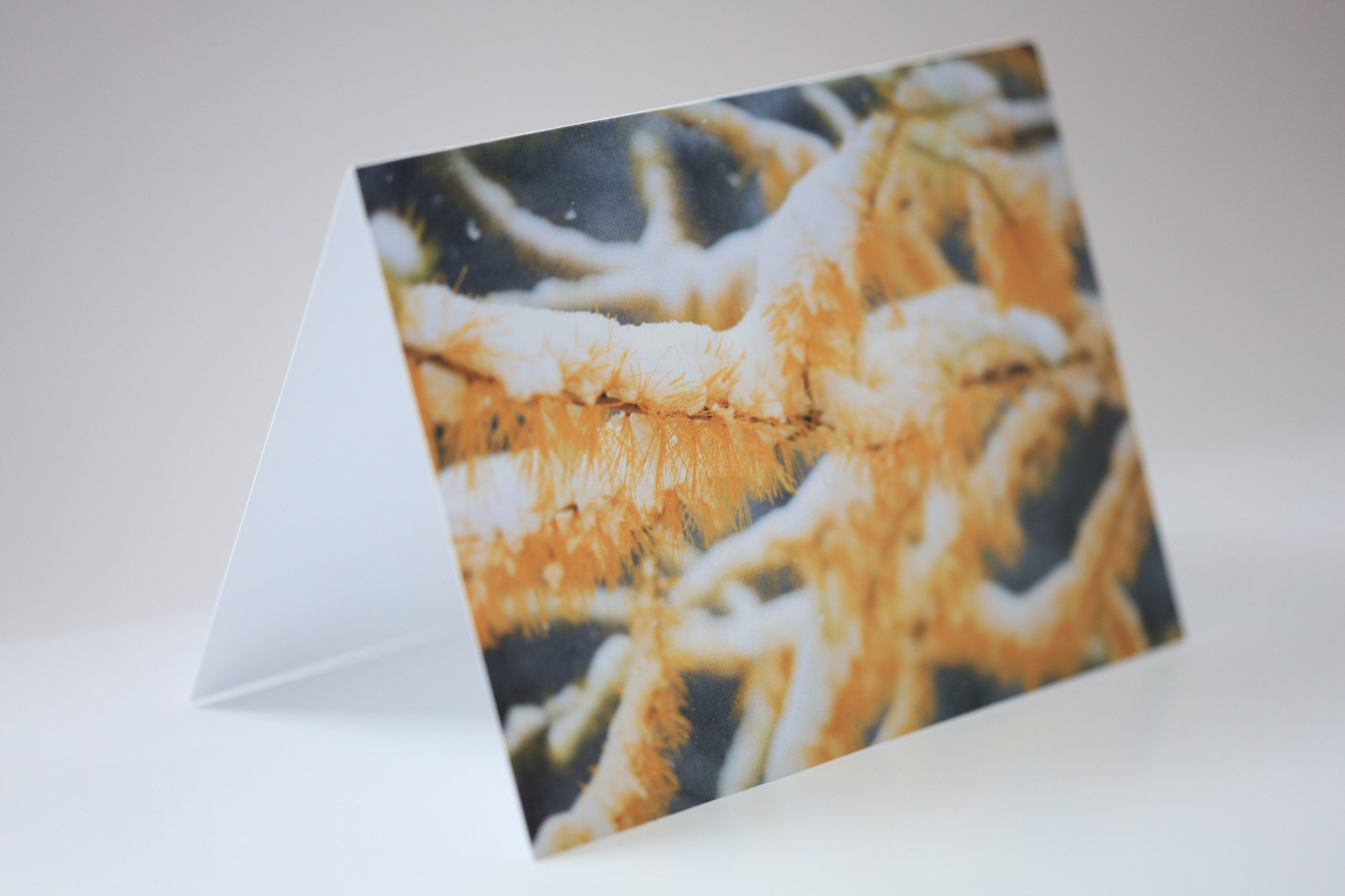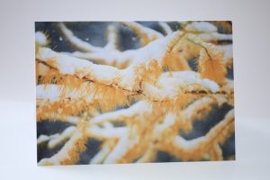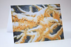 Greeting card “First Snow on Tamarack Branches” with original Fine Art Photography by artist Natalia Rose.