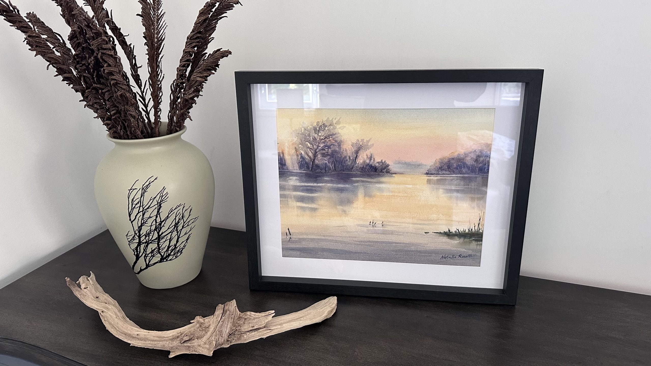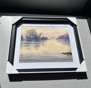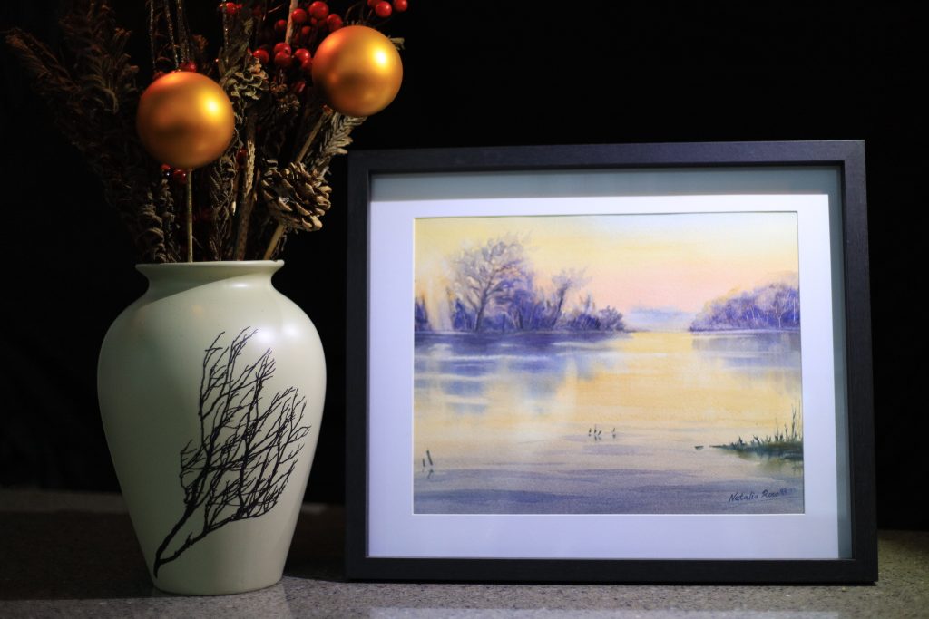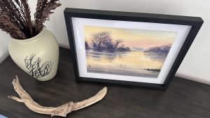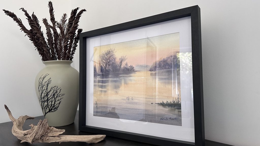 Original watercolour painting of a still lake in early morning. Soft morning glow rises from the horizon and colours the sky in pink and golden hues; the water reflects the sky, taking on its colours. This painting is framed in a black wooden frame with a 2″ mat.