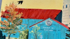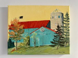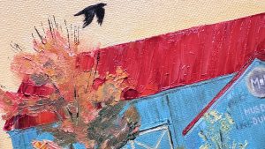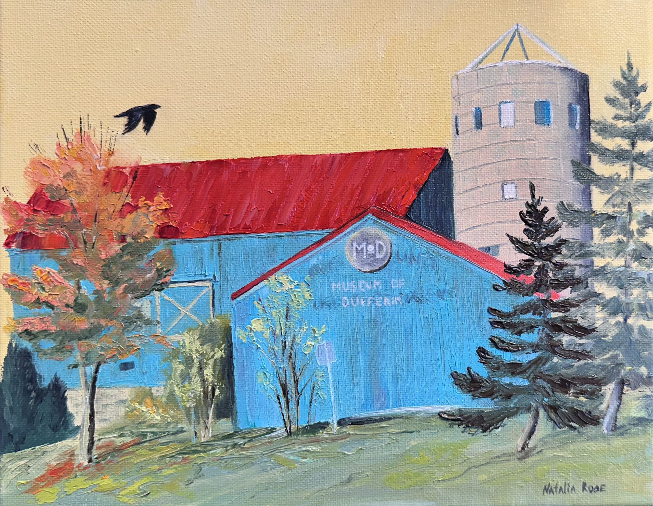 Original oil painting with Museum of Dufferin set against a beautiful pale yellow sky. The scene is set in the fall with foliage standing against the bluish-green walls of the building. A crow is flying by towards town of Mono.