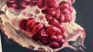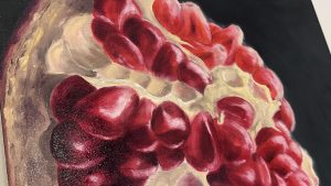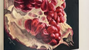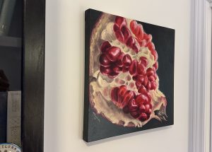 A pomegranate with exposed bright red, juicy and transparent arils. The light is caught in them, shining through and making them be alight like little lanterns. This painting was done from a live arrangement, and it looks so real and juicy! Can you taste it in your mouth?