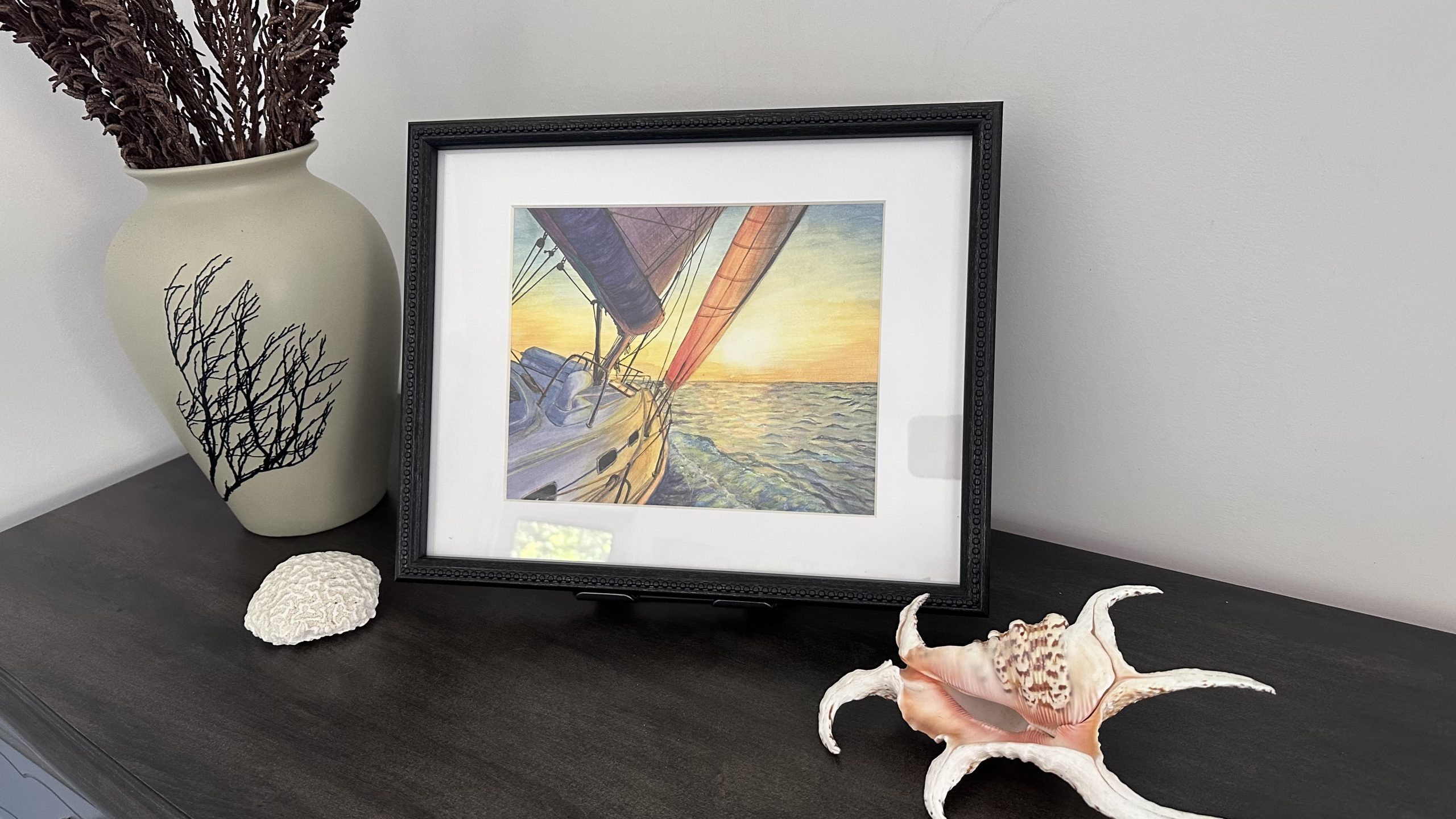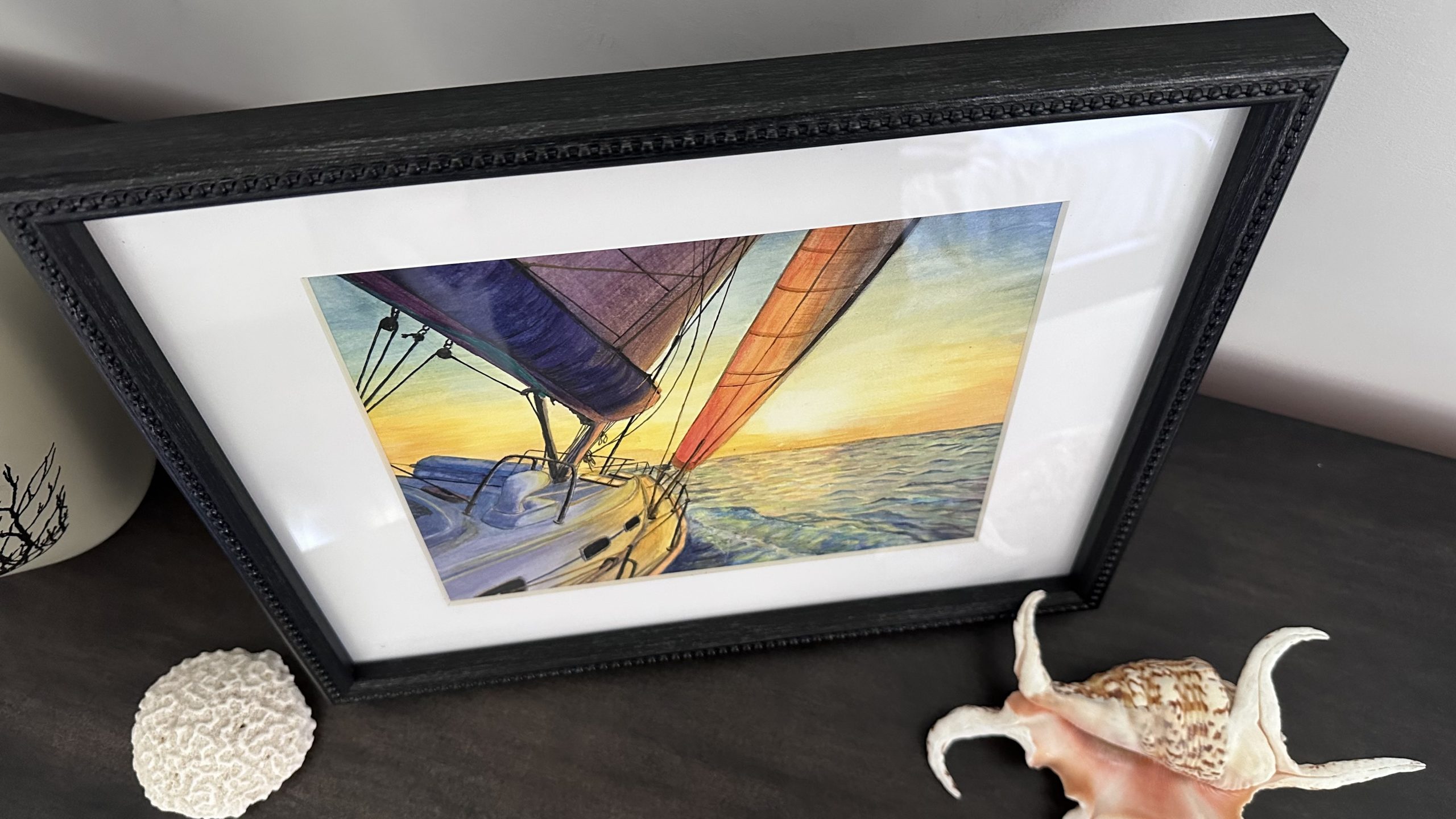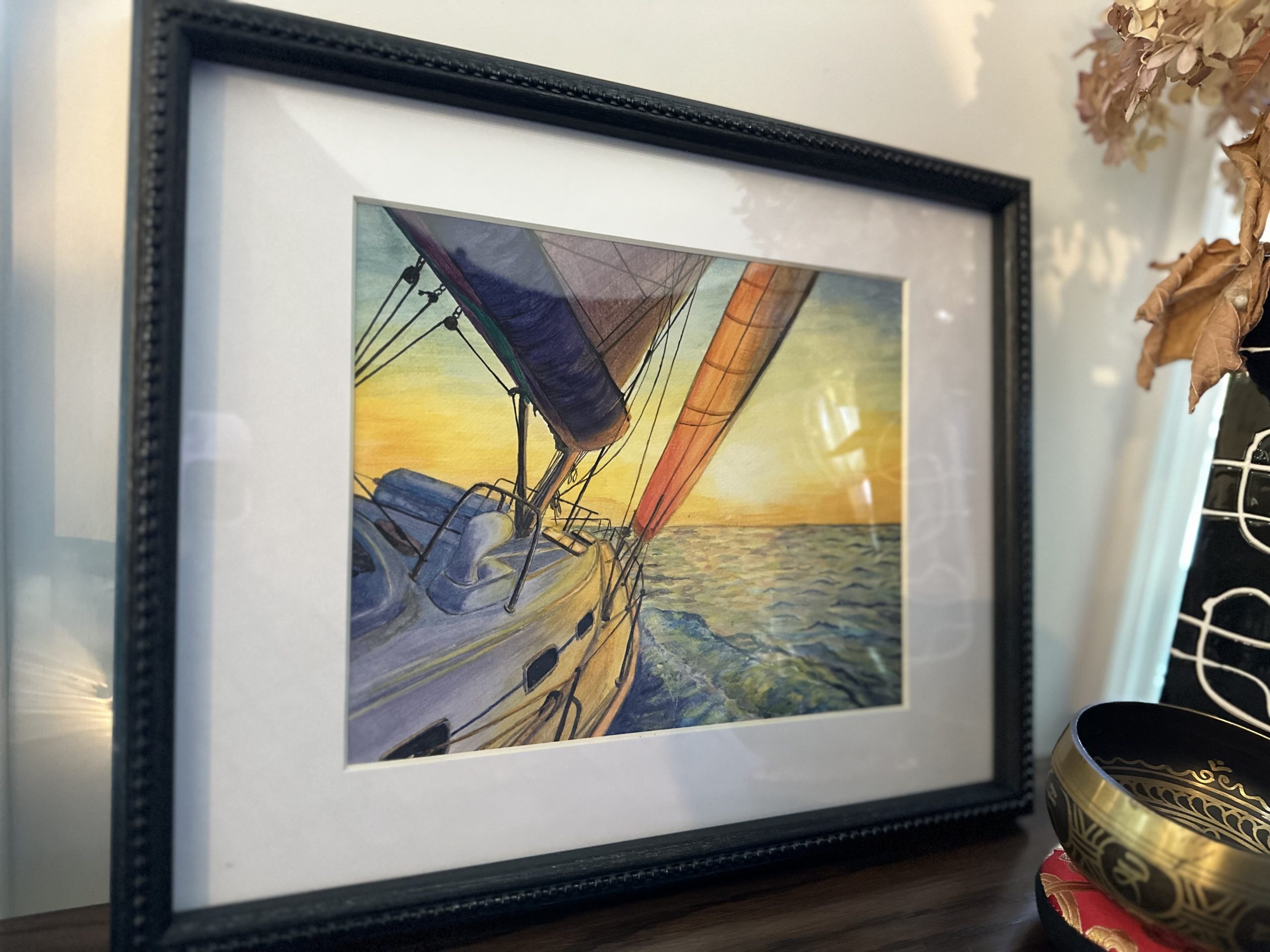 Original watercolour painting with minor elements of acrylics titled “Sailing to the Sunset”; framed in a beautiful black wooden frame with a 2″ white mat.