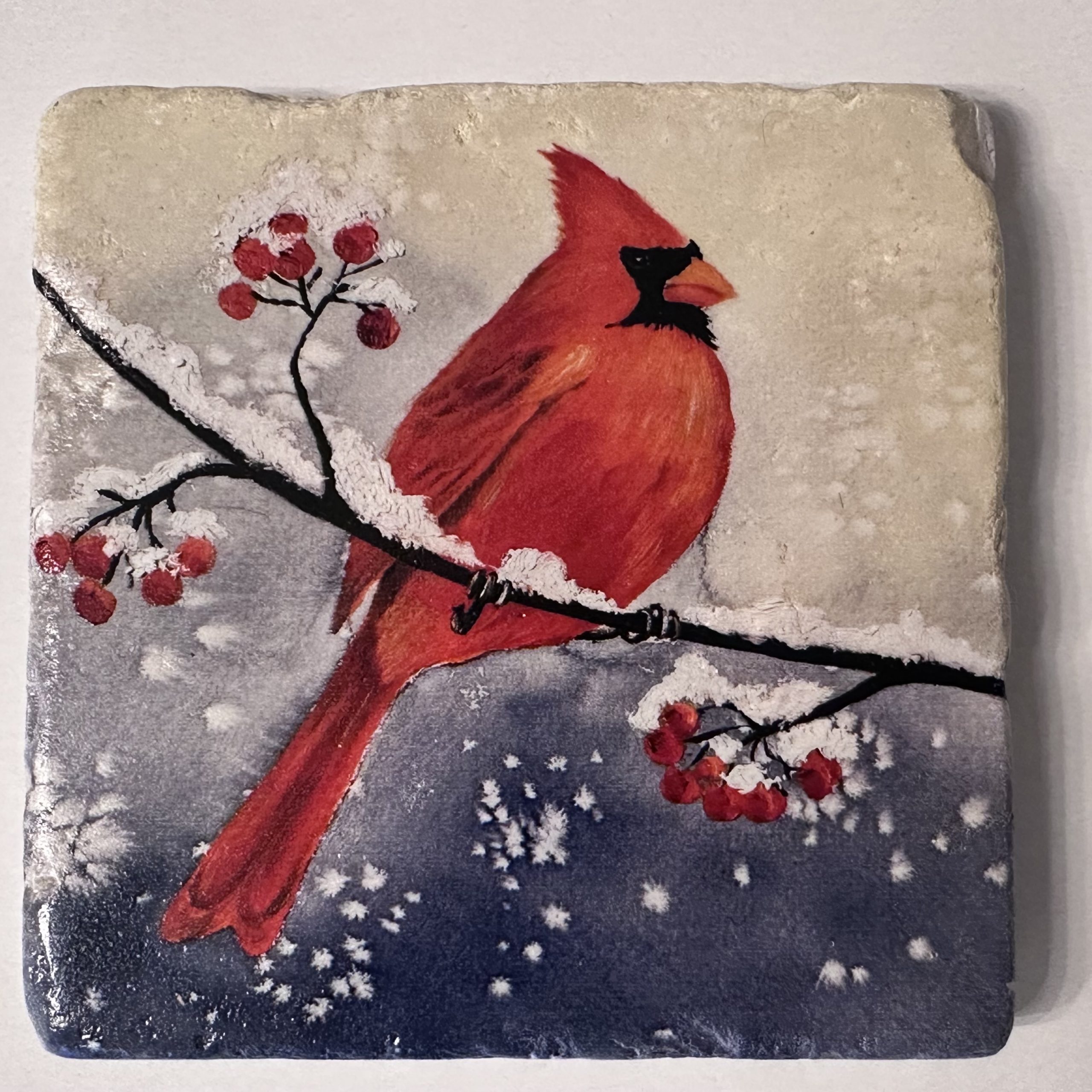 Stone Coaster with Cardinal on a Branch with Berries