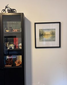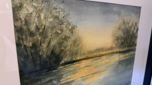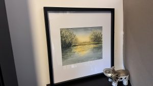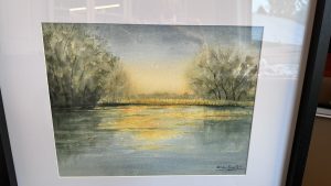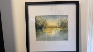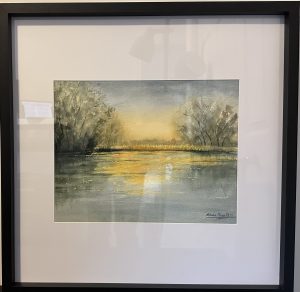 Original watercolour painting “Sunrise on the Lake”. Framed in a beautiful black frame with a wide white mat.