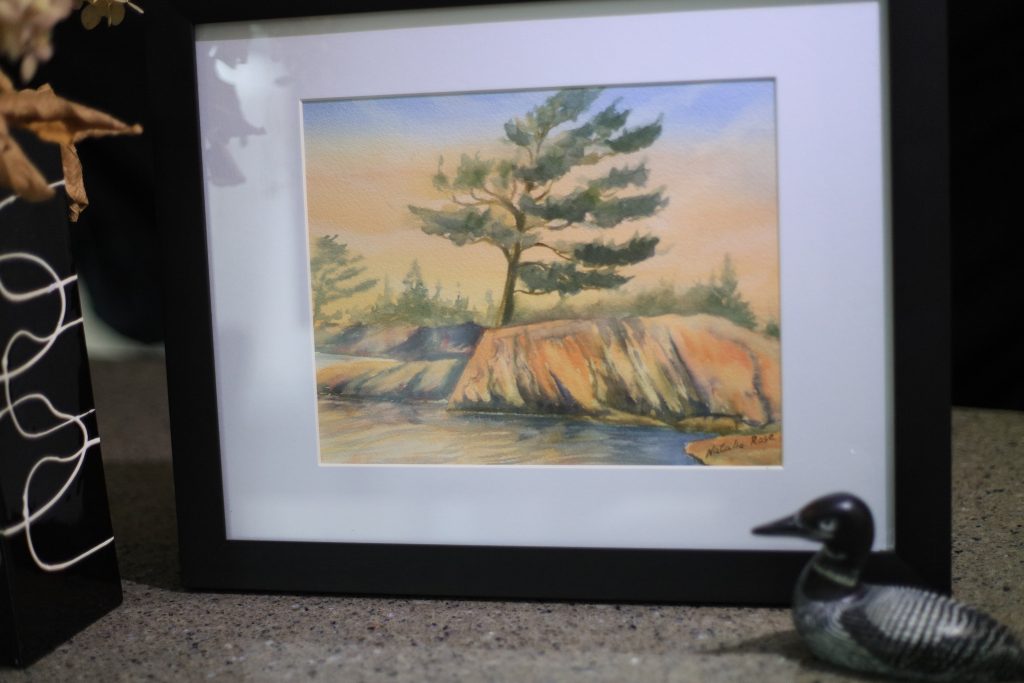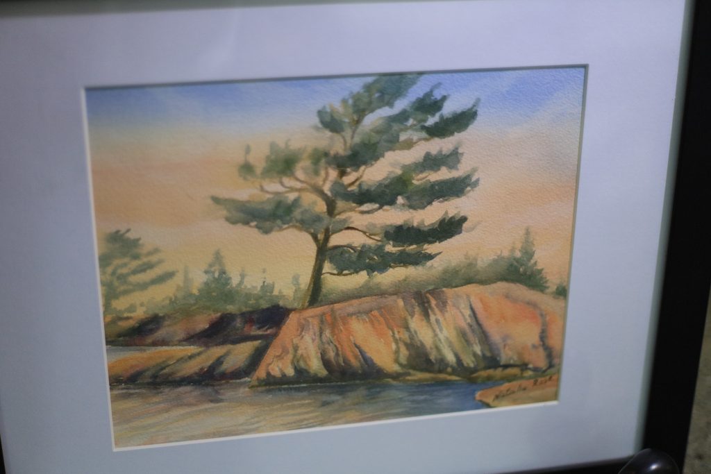 Original watercolour painting “White Pines of Muskoka”. Framed in a black wooden frame with white mat.