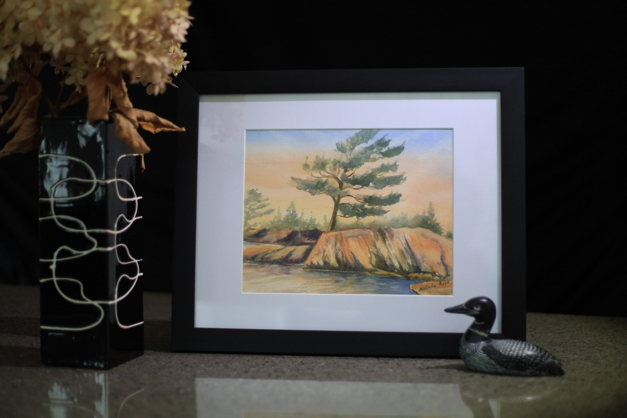Original watercolour painting “White Pines of Muskoka” in a black wooden frame.